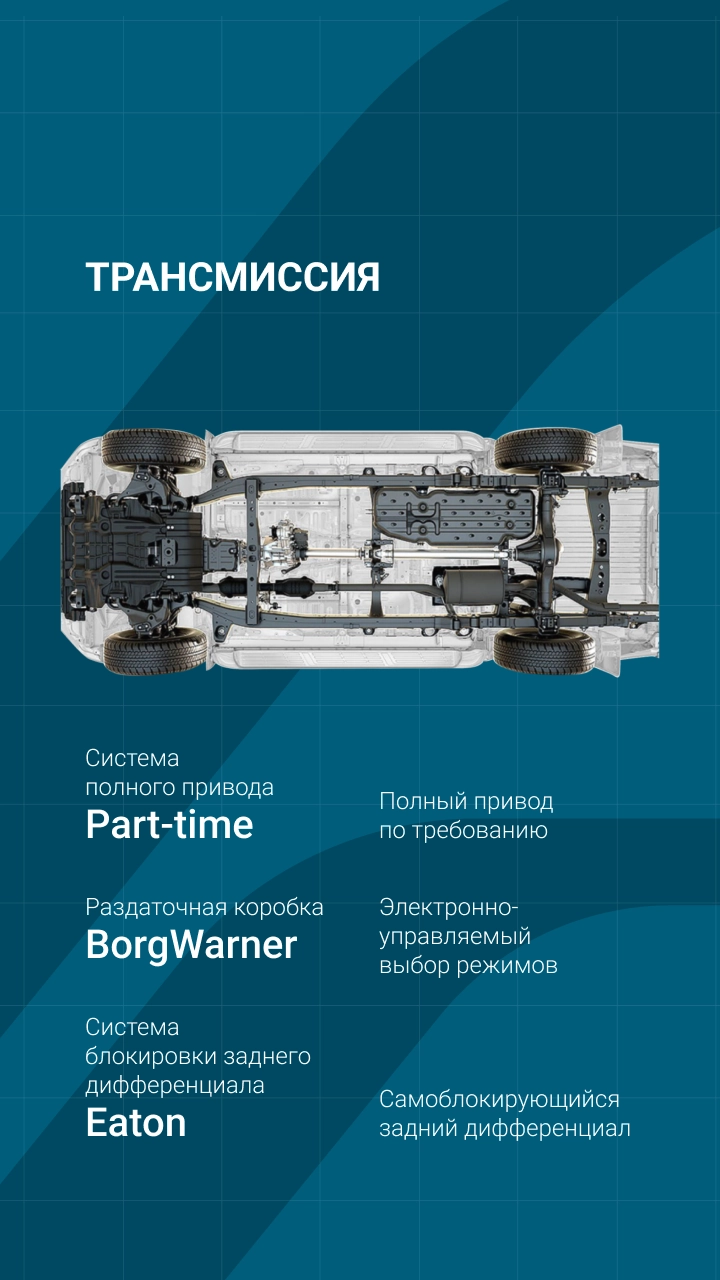 | Селектор выбора типа привода: задний, полный, полный с пониженной передачей | ✔ | ✔ | ✔ |